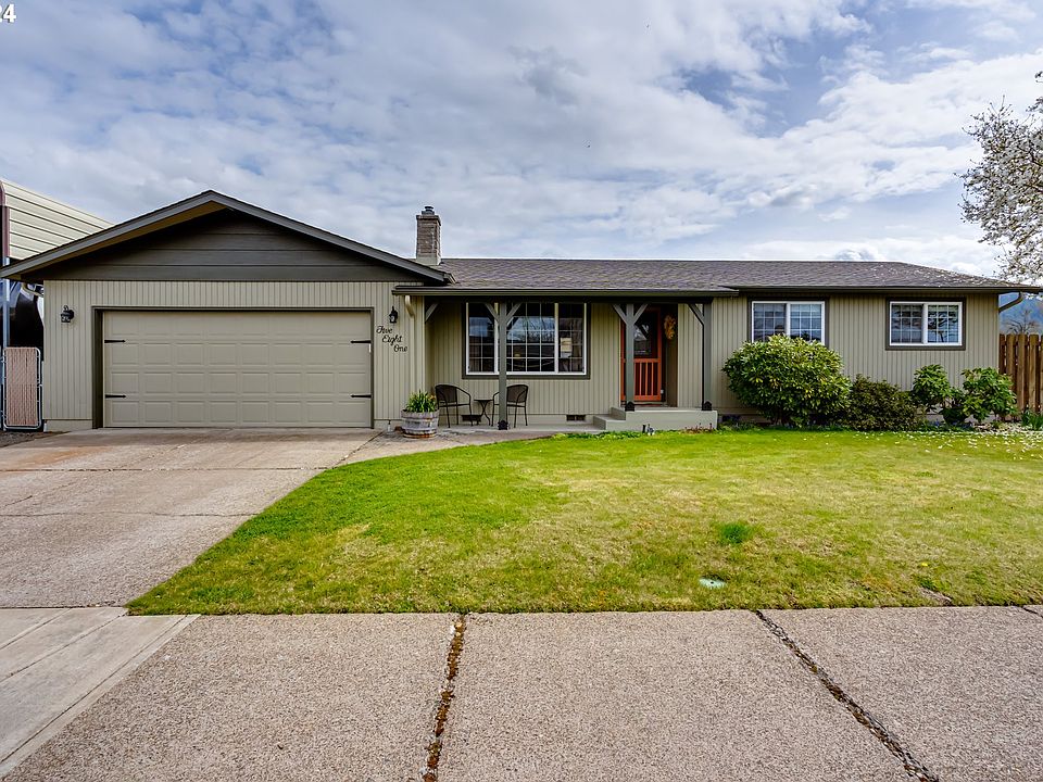 Meticulously maintained single level home in desirable Thurston neighborhood! Hard to find 4th bedroom or 3 bedrooms plus office! Beautifully hand crafted fireplace surround with pellet stove. Kitchen has maple cabinets, large pantry, updated lighting, counters & backsplash. Updated bathrooms, doors and trim. Newer roof, paint and hot water heater. Low maintenance, nicely fenced backyard has patio with retractable awning. Fully gated & covered RV parking! Double gate has 10' wide & 12' wide gates with separate man gate. Covered area fits 12 x 35 RV. Separate 10 x 12 locking shed. Two car garage with work bench area. This one wont last long!