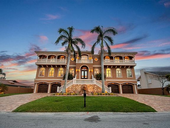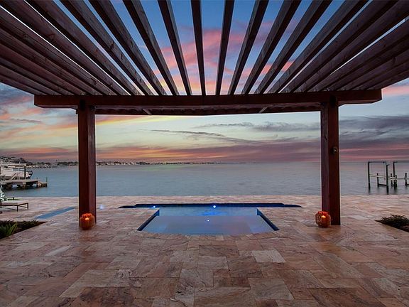 Extraordinary Mediterranean-inspired waterfront estate, perfectly positioned on open water in South Tampa. Designed for those who seek sophistication, comfort, and sweeping water views, this grand residence blends timeless elegance and modern luxury in one of Tampa Bay’s most in-demand locations. From the moment you arrive, you’re greeted by a stately façade reminiscent of a Tuscan villa—idyllic fountain, grand staircase, and oversized wood doors. Step into the main living area and be captivated by soaring 24ft ceilings and unobstructed water views. The main living area sits on the third level for the ultimate in enhanced water views, privacy, and security. The expansive great room showcases floor-to-ceiling impact-rated windows and French doors that fill the home with natural light while offering panoramic views. Step through one of three sets of French doors onto a spacious covered balcony overlooking the outdoor oasis, highlighted by a one-year-new beach-entry pool and spa, travertine patio, and a custom pergola with a rain waterfall feature that creates a serene setting for relaxation and entertaining. The travertine patio extends to the seawall, which was completely rebuilt 3 years ago and includes a travertine cap for a seamless look. With a deep 14ft channel, this home is ideal for accommodating larger boats—there is ample space to build an extended dock or utilize the marina around the corner. Just off the great room, the formal dining room boasts an elegant ambiance for entertaining. The luxury kitchen is a chef’s dream, equipped with top-of-the-line appliances, custom cabinetry, a large island, walk-in pantry, and a sun-drenched breakfast area overlooking the water. This level also includes a richly appointed home office with custom wood built-ins and a spacious den with a full wet bar set against open-bay vistas. The fourth level hosts the primary suite—a luxurious retreat featuring a private balcony with expansive water views and stunning sunsets. The spa-inspired bath exudes elegance, featuring a deep soaking tub for ultimate relaxation, an expansive walk-in shower with upscale finishes, and a generously sized walk-in closet designed for boutique-style wardrobe organization. Across the split level are two additional ensuite bedrooms—both with private balconies and stunning views. Crowning the home is a top-level observation deck, where you can enjoy panoramic views and sunset cocktails with friends. Below the main living areas, the second level is designed for flexibility and privacy, featuring an additional entrance, full kitchen, two beds, two baths, and a large open-concept living/media room—perfect as an in-law suite or additional entertainment area large enough for a TV area, pool table and more. The home features a split garage on the ground level, each side with epoxy floors, accommodating 4 full-sized vehicles plus room for an additional compact car (or more with the addition of a lift). The climate-controlled garage—complete with soaring 10ft ceilings—is a rare offering for the discerning automotive enthusiast. A hydraulic elevator provides convenient access to all floors. This home was engineered for coastal resilience—all doors and windows are impact-rated, and a new roof was installed in 2025 for added peace of mind.