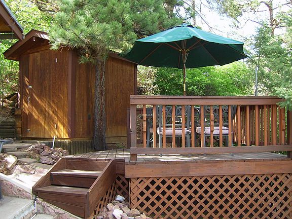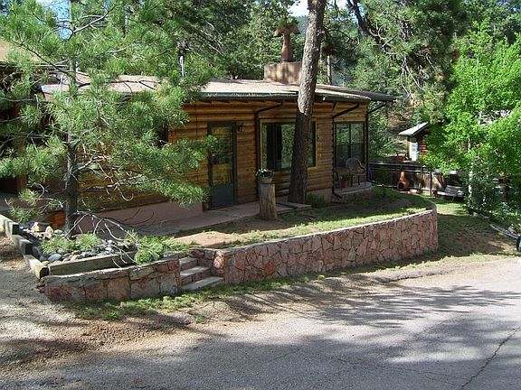 MOUNTAIN LIVING AT IT'S BEST! Beautiful fenced yard with wood deck on side. Nestled with blue spruce, scrub oak and pine trees-Ponderosa Pines. Large Storage Shed has elec & light, Panoramic/Mountain Views. Wood Fireplace that has real moss rock surrounding it. Knotty pine log wrapping the walls. A wall of windows in 3rd bedroom, small office nook off 3rd bedroom.