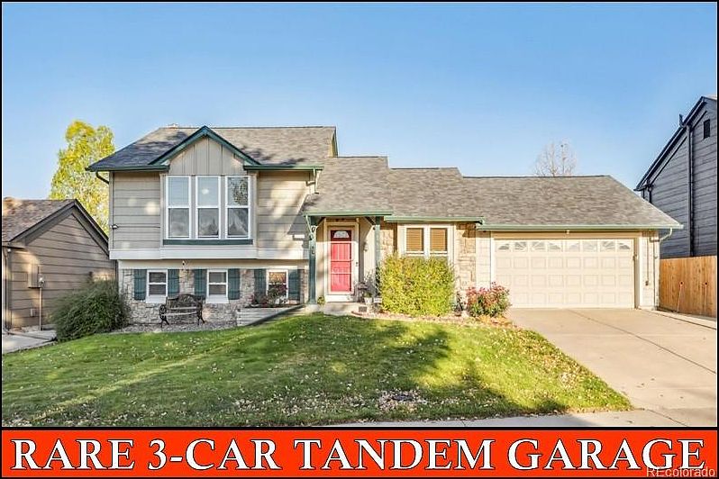 Updated Split-Level in Parkborough with Oversized 3 Car Garage– Move-In Ready Top to Bottom! You’ll love the sunny, west-facing main level featuring formal living and dining rooms and a spacious kitchen with 42” maple cabinets, soft-close drawers and pull-outs, Corian countertops, brand-new stainless steel appliances, and heated tile floors. Upstairs, you’ll find two generous bedrooms that share a fully updated hall bath—complete with a heated floor and private access from the primary bedroom. The lower level offers a cozy family room with a gas fireplace and custom mantle, plus a guest bedroom, updated ¾ bath with heated tile floors, and laundry area. The partially finished basement provides even more flexibility—ideal for a home office, gym, hobby room, or extra storage. Step outside to your park-like backyard featuring a composite deck with built-in lights and a gas line—perfect for grilling and summer entertaining. The fenced yard is great for kids and pets, and there’s even a storage shed for tools and equipment. Car enthusiasts and hobbyists will love the HUGE 910 sq. ft. fully insulated garage with built-in cabinets and a workbench. Additional Highlights Include: Ring doorbell included, central A/C + ceiling fans in every room, newer 50-gallon water heater (2022), Ting Fiber 2G Internet, exterior painted in 2020, newer Class 4 roof (2022), quiet neighborhood location with easy access to Southlands, E-470, DIA, DTC, and more! Don’t miss this terrific home that’s truly move-in ready—updated, comfortable, and loaded with extras!