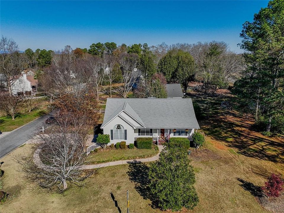 Sought after ranch with finished basement in well established neighborhood swim community with low turnover. Roommate floorplan with private primary bedroom. Close to Downton Dawsonville with shopping, restaurants etc. and minutes to the GA 400 for commuting etc. Quaint front porch. Open floorplan of dining and living room-vaulted ceiling, fan and gorgeous fireplace, hardwood floors in entrance, dining and living room have just been refinished -freshly painted , new flooring in kitchen,white cabinets with new pulls,: new marble patterned quartz counter tops,gas stove, new stainless sink and new flooring-deck off living room- Kitchen is eat in with pantry and full laundry to the left. Tankless water heater. Sizeable primary bedroom w/ large bathroom & walk in closet w/ closet system is separate from the other 2 bedrooms which share a full bathroom consisting of shower over tub. Plenty of storage. Wood grain vinyl flooring in hallways, bedrooms and kitchen Lower level consists of a room that has been used as a bedroom w/ the closet outside the room and armoire which remains with the property,large walk in shower tiled bathroom, full size family room and tons of storage for all your needs. The garage is to the left side of home with tons of level parking for cars. Spacious backyard to create your own oasis. Septic system just been serviced. A must see. Talk to me about a buy down rate for your mortgage. backyard has many options--