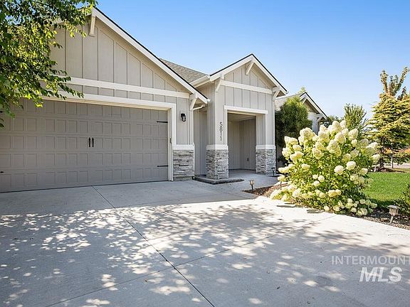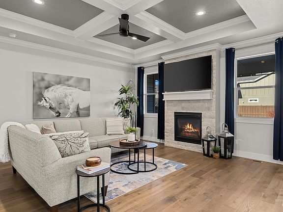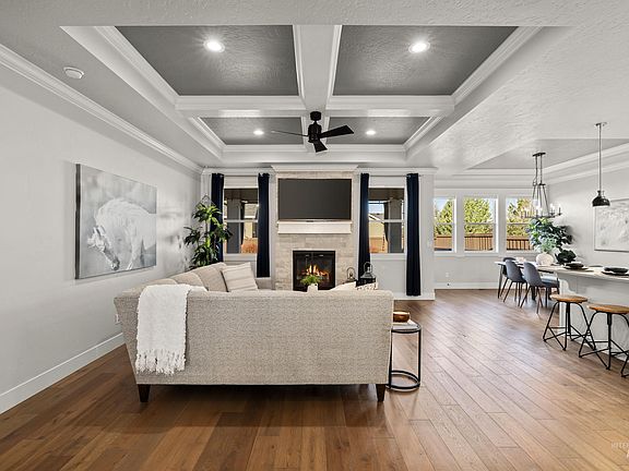 Stunning Custom Home by Todd Campbell located in Meridian's Bainbridge subdivision! This exquisite custom home, built in 2018, showcases exceptional craftsmanship and modern elegance. Designed with a bright, airy ambiance, the open-concept layout seamlessly blends the kitchen and spacious great room, perfect for both entertaining and everyday living. The kitchen features a large island, abundant cabinetry, and high-end finishes. The split-bedroom layout ensures privacy, while coffered ceilings, designer lighting, and refined details elevate the home’s sophistication. The primary suite is a spa-like retreat with a beautiful fully tiled walk-in shower, and dual vanities. Just a short walk to the community pool and close to shopping and restaurants! Experience luxury and comfort in this exceptional Meridian home!