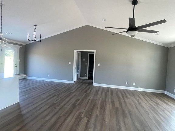 Living Room: Features a vaulted ceiling and ceiling fan, creating a bright and airy atmosphere that adds to the home's spacious feel.