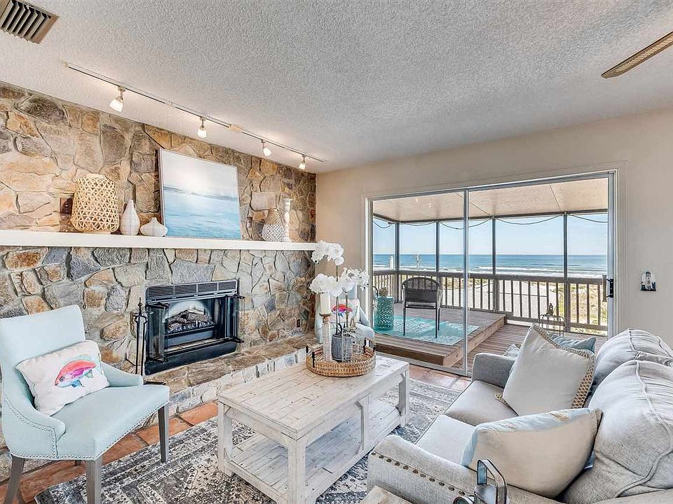 A new beach house for the new year! Feel the ocean breeze and hear the rolling waves while you take in panoramic views of stunning Butler Beach from the expansive screened porch. Better than direct ocean front living, this multi-level home sits high and dry on the dune, offering impressive views of both the ocean and the intracoastal waterway. In this ideal location, you will feel like you are on vacation all the time! The amazing views are not just visible from the porch, but from nearly the entire third floor living space, in which you will find the kitchen, eat-in area, spacious living room, and a half bathroom. The second floor offers three spacious bedrooms and two full baths. The master bedroom faces East, taking advantage of beautiful beach views through large windows. The master bedroom also features a walk in closet that extends the length of the room, as well as a separate ensuite space that could be used an an office, den or smaller bedroom. What great flexibility for a growing family, multi-generational family or vacation home! On the first floor is where you will find the two-car garage, along with a workman's corner including a partial bath and storage space. More storage, including a shed, is located on the East side of the house, behind the lattice, for storing beach toys, yard tools and more. Additional features include an updated master bathroom with contemporary tile and granite, Mexican tile on third level, metal roof that was recently recoated, outdoor shower, ceiling fans throughout, inside laundry space, decks on the West side of the house on the second and third levels, electric fireplace and ample storage space. This home has been lovingly maintained by the same owners for the past 24 years, and is ready to be snatched up by someone new. Do not miss this opportunity to own your piece of paradise in one of the most beautiful and sought-after destinations!