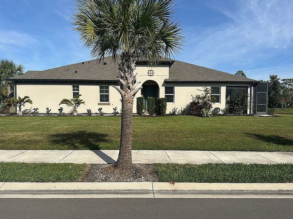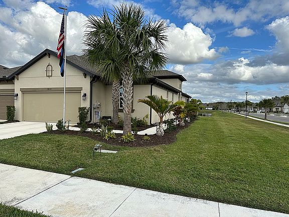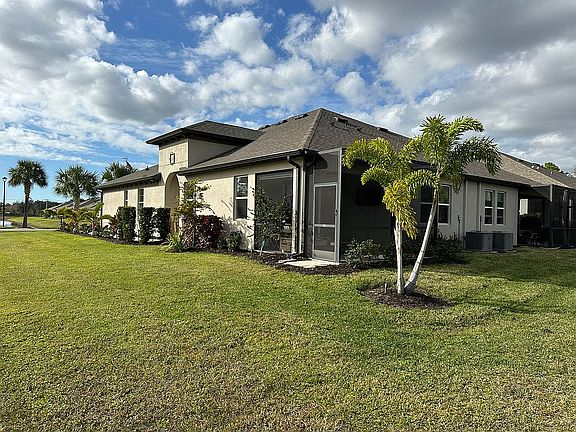 Welcome home to this immaculate, well maintained home located in the gated Amberly Community. This spacious Villa, boasts a split floor plan with numerous upgrades on a premium corner lot with water views. It features 2 bedrooms, 2 baths and a dedicated office / den. The Kitchen contains a large island, with quartz countertops, SS appliances, glass tile backsplash, a walk in pantry and under cabinet lighting. The master suite has tray ceilings, large walk walk in glass enclosed shower with floor to ceiling tiles, double sinks with quartz countertops and a custom walk in closet. The extended screened in lanai has water views overlooking the community pool. The extended garage contains numerous storage upgrades, sink, epoxy floors, water softener and is pre wired for a portable generator. This maintenance free community has low HOA fees, NO CDD and is located near shops, restaurants, schools, beaches and entertainment.