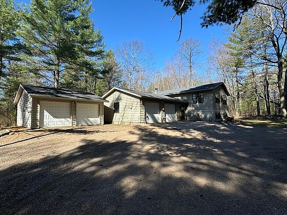 Exceptionally well-maintained home featuring 4 acres on Hwy 51, zoned Industrial offering tremendous opportunities! Prime location in between the Community Church and the Fire Department, this is an ideal spot for your dream business. Three 2-car garages total 1824 square feet for abundant storage, plus a 500 square foot cottage that would even be great for a retail shop. All the buildings are neatly wrapped in cedar siding and surrounded by beautiful massive white pines. Inside this gorgeous home, you’ll find the most charming Northwoods appeal! Knotty pine walls and ceiling, large beams, stone wood burning fireplace, center island in kitchen, huge private deck, central air and wired & equipped for portable generator that is included! What a fantastic package deal!