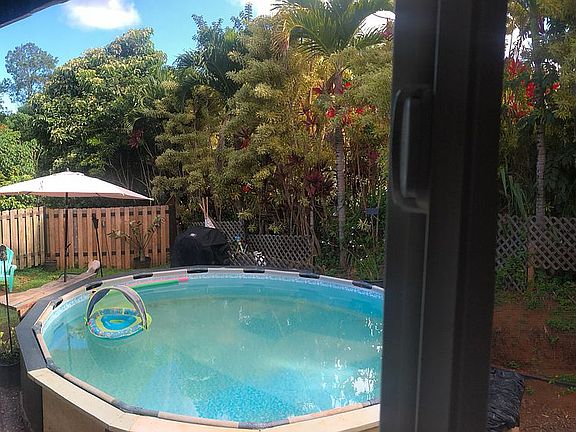 This unique secluded 1 acre property in the country yet close to town provides an elevated home site atop a small hillside in a lush valley with stream and park-like setting.1520 sq ft 3 bedroom, 2 bath with front and back lanai. Beautifully landscaped hillside leading to a built around above ground pool. Small shed down hill beside creek. Great for yard equipment and tools. Children love fishing for prawns and other fish in the creek. Lots of potential for many projects such as adding an attached or detached garage, expanding lanai to full or partial wrap around. Can even add a door from one of the bedroom leading out to the pool area. Selling as is with most furniture included if interested.