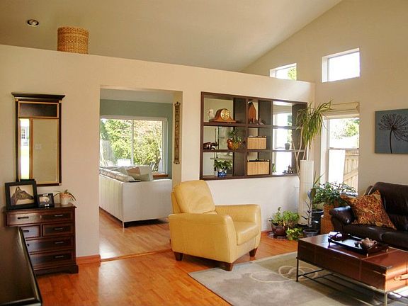 Captivating..! Impeccable rambler.great room style living, dining and kitchen with open shelved decorater wall. Vaulted ceilings. Gas heat and fireplace. Sunny kitchen-all the built-ins. Full bath off master bedroom. Den/office added-not included in square footage-used part of garage-easily reconverted. Beautiful landscaped rear yard..fully fenced with patio and deck..Sherwood a top quality division in Silver Firs. Cedar siding & new 40 year roof. Elementary steps away. Be quick on this one!