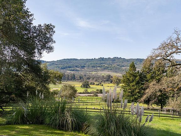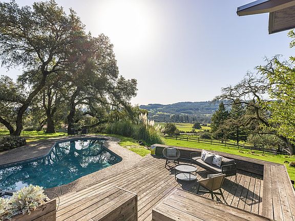 Gracefully oriented on 33 + acres in the heart of the breathtaking Bennett Valley, this mid-century contemporary gem was masterfully designed in the 60's and has recently undergone a refreshing transformation under the guidance of award-winning architect, Robert Zinkhan. The dramatic living room boasts soaring open beam ceilings, walls of glass that invite the outside in, a cozy fireplace, and elegant French glass doors that open to a picturesque terrace perfect for dining al fresco. The kitchen features state-of-the-art stainless-steel appliances, granite countertops and offers serene views of mature trees and landscaped gardens through its expansive glass walls. The family room is adorned with a whimsical round window, open beam ceiling, a large dual sided fireplace shared with the media room, and expansive sliding doors that beckon you out to enjoy the tranquil setting and pristine swimming pool. This home features four bedrooms, including two expansive primary suites. One of these luxurious primary bedrooms is perched in a separate pavilion, just a few steps from the main home. There's a stout 2,000 sqft+/- 4 stall horse barn with living quarters above which are quite charming. This secluded property, nestled at the end of a quiet country lane, offers unparalleled privacy! The majestic oak trees and sweeping valley views of distant vineyards and Jess Jackson's 1,100 acre Jackson park truly awe-inspiring. Other features of the property: caretaker cottage, engineered outdoor arena, separate 3 car garage & separate 3 car carport. There is an additional parcel for those who wish to create a family compound or to sell off a portion.