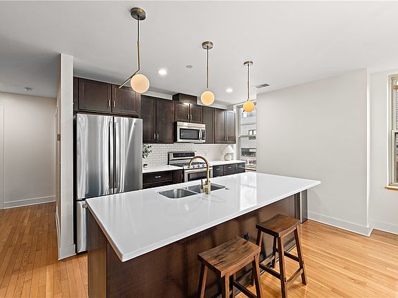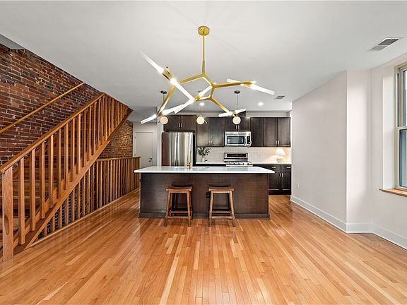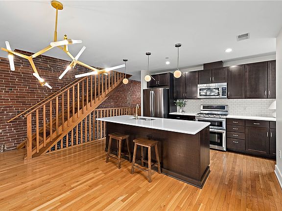 This charming brownstone stands tall in the heart of East Liberty on a quiet street just steps from the shops and restaurants on Penn Avenue. Inside the updated three bed, two and a half bath condo, the rooms are spacious and airy with high ceilings and large windows. The natural hardwood, exposed brick, and recessed lighting create a warm and inviting living space. The kitchen is modern and well-equipped, with stainless steel appliances and quartz countertops. Upstairs, you’ll find three bedrooms, two full bathrooms, and a conveniently placed laundry room. The large primary bedroom features a set of French doors and a high-end shower system in the ensuite. The bay window and exposed brick add character to the front bedroom and the third bedroom can easily double as a home office or workout space. In the basement is a spacious shared storage area and behind the building is a gated off-street parking lot.