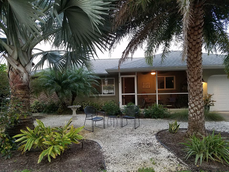 Enjoy FL in this beautiful 2 Bed, 2 Bath open concept home with vaulted ceilings in a split bedroom layout within hiking distance to Manasota Beach. Expansive wraparound indoor/outdoor area w/ slide-away doors includes 270 sq ft screened lanai plus 940 sq ft of additional covered patio space with cedar wood outdoor shower and inviting front screened porch. Beautifully landscaped front yard with mature palms & white shell paths. Gorgeous white kitchen with granite countertops, undermount extra-large deep sink, soft close drawers, large pantry area with pull-out shelves, lower storage drawers, open shelving, reverse osmosis water at the sink, garbage disposal, quiet Maytag dishwasher w/stainless steel interior, microwave vent hood. Master bedroom with walk in closet, tile surround, & deep soaker tub. 2nd BR has attached bath with tile shower. All insulated hurricane windows and garage door w/ opener, insulated attic w/ solar attic fan. Ceiling fans in every room, New 160 sq ft shed in backyard, New roof in 2015