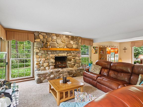 We are proud to present to you this beautiful 4-bedroom, 2.5-bath home located in the highly sought-after subdivision of Martin Woods in McHenry. This comfortable home sits on a private 1.2-acre lot that backs into trees and mature foliage, giving you gorgeous views of nature. As you enter the home, you'll be greeted by a large foyer that welcomes you to a custom floor plan designed for comfort and convenience. The living room focuses on a stunning floor-to-ceiling fieldstone fireplace that adds warmth and coziness to the space. The first floor also includes a separate dining room, ideal for hosting dinner parties and family gatherings. This home offers many amenities, such as central air, central vacuum, replacement windows, and a partially finished basement with tons of storage and a recreation area with a pool table and bar. You will also appreciate the convenience of a 1st floor laundry room, a feature that makes it easy to keep your home clean and tidy. Outside, you'll find a lovely brick paver patio that leads to a backyard fire pit, perfect for hosting summer barbecues or intimate get-togethers. The property also includes a storage shed that provides additional space for your family's toys and hobbies. Newer exterior paint and newer roof! With a large driveway that can easily accommodate multiple cars, you'll have plenty of room for your vehicles in your attached 3 car garage. This beautiful home is located near all the amenities that McHenry has to offer, including shopping, dining, and entertainment. Don't miss this opportunity to own a piece of paradise in Martin Woods!