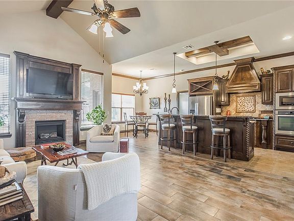 This East Edmond home is on a corner lot in an exclusive gated community just east of I-35. Open concept plan with vaulted ceiling living room and gas fireplace. The kitchen has a breakfast bar, stainless newer appliances, granite, and pantry. The front bedrooms were opened to make a fabulous large room with sitting area and two closets. The upstairs bonus room could function as a fourth bedroom with a half bath and closet. The master has a double vanity, walk-in shower and large closet. The covered back patio has a fabulous wood burning fireplace, landscaping and privacy fence to enjoy year round.