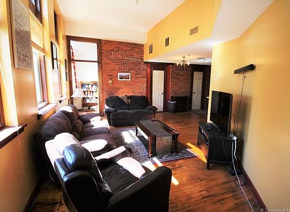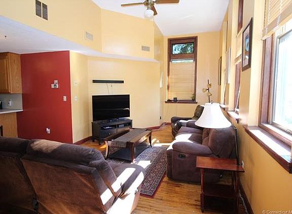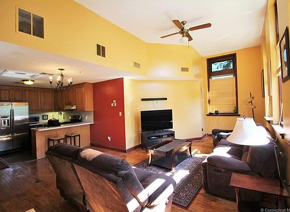 Great opportunity to own in Meriden! Come see this fantastic 2 bedroom townhouse that boasts high ceilings and gleaming hardwood floors. The open floor plan in this townhome provides a very bright and spacious feel, with a nice eat in kitchen to include stainless steel appliances, and huge windows that surround the living area. Two large bedrooms await you on the upper level, the master equipped with beamed ceilings, skylight, and unique loft space. Upper level laundry too! Check it out for yourself- these wonderful architectural features will not disappoint!