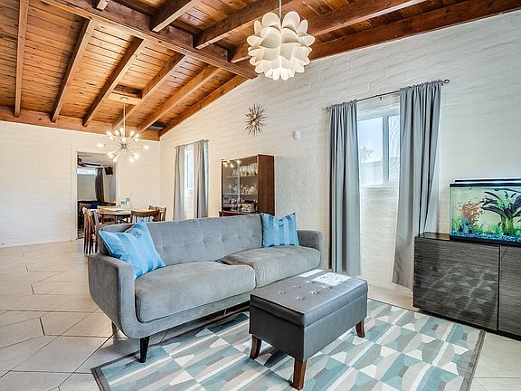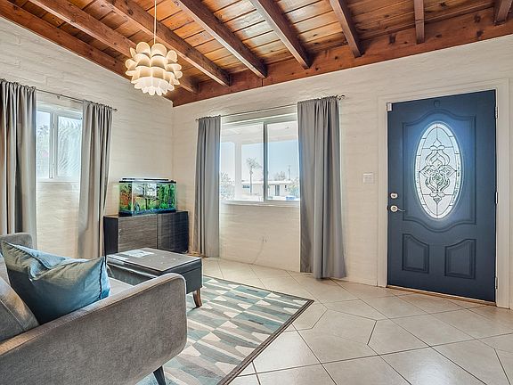 Gorgeous mid century ranch style home, truly turn-key ready! This beautiful home features: 3 beds/2 baths, 2 car garage, exposed wood beam ceilings, roof recoated 2017 w/7yr product, tile counters/backsplash in kitchen, movable island (stays!), huge covered patio, bonus family room/wired for surround sound (can be easily converted into bedrm!), ceiling fans throughout, alarm system installed (just activate service), decorative corrugated metal fencing, washer/dryer (stay!), toilets were upgraded in 2017, tons of storgage, & a great backyard for entertaining w/pavers & gravel. Professionally cleaned and ready to move in! Conveniently located to everything, call today for a private showing!