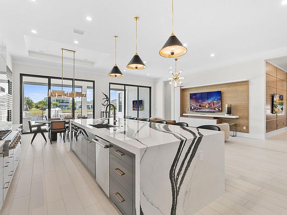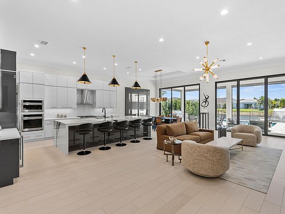 This stunning home is the largest single-story model in Artistry and is situated on a premium homesite with southern exposure and direct lake & fountain views! This impeccable home was just built and enhanced with over $500,000 of luxurious features! This 3 bedroom 3.1 bathroom home was designed to unwind and entertain. The swanky clubroom adds to the expansive space, and can also be a 4th bedroom. The gourmet kitchen features elevated cabinets, Monogram appliances with gas cooktop, 48'' refrigerator, quartz countertops & island with waterfall, and a dry bar complete w/ a wine cooler & ice maker. The primary bedroom & bathroom are a serene retreat with stylish lighting fixtures, a soaking tub, frameless shower, and a Toto bidet toilet. All closets are custom built by California Closets. Enjoy your backyard and summer kitchen in any weather with a large covered lanai and motorized phantom screen. Relax in the saltwater heated pool with beautiful water features. The home has two air-conditioned garages to fit 3 cars, and one is outfitted with an outlet to charge your EV vehicle. Some additional features that are sure to impress are: motorized Hunter Douglas window treatments throughout, a whole house generator, custom stone walls with built-ins, crown molding, and LED chips in all lighting fixtures so you never have to change a bulb! The home is fully automated with smart locks, a video doorbell, alarm and smart thermostat. Artistry residents have a gated entrance and exclusive access to a beautiful clubhouse with fitness center, resort-style pool, basketball courts, and more. Benefit from A-rated schools and proximity to pristine beaches, upscale shopping, exquisite dining, and golf courses. This home has it all. Don't miss the opportunity to make this home yours.
