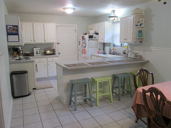 Bright, open kitchen with large breakfast bar and tile floors.