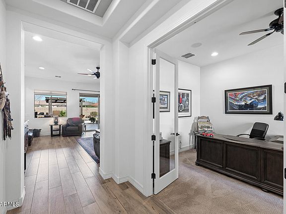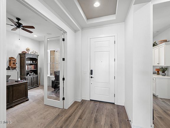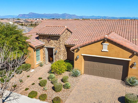 Discover a hidden gem in Encore at Eastmark! This home, tucked away on a prime lot, invites you to explore its wonders. Picture yourself gazing at breathtaking mountain views from your backyard oasis, complete with a pergola-covered kitchen and lush landscaping. Step inside to find a spacious layout adorned with 3 bedrooms and an office. The chef's kitchen beckons with stainless steel appliances and granite counters, while upgrades like wood-like tile floors and plantation shutters add a touch of luxury. Don't miss the extended garage, huge lot (room for your very own pool) boasting sleek epoxy floors. And that's just the beginning—Encore offers resort-style amenities including tennis & pickleball courts and a fitness center. Embark on a journey to active adult living at its finest!