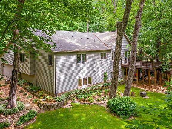 Your Tree Top Living awaits. This property has it all! Some many updates in the last 6 years! Walk into the huge foyer and up to the vaulted living room, kitchen, dining area. Kitchen has updated quartz countertops, backsplash, hardware. Walnut flooring throughout the main living area. Sunroom to tiered decks. Large master bedroom with remodeled master bathroom. Step into the travertine tiled shower with massive rain shower head. Heated ceramic flooring and granite countertops on dual vanities. Main living room has a brick gas fireplace and lower level has woodburning fireplace. Wall could be put back in for non-conforming room.