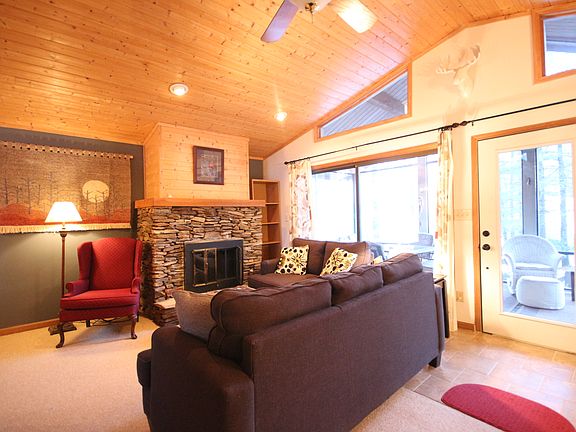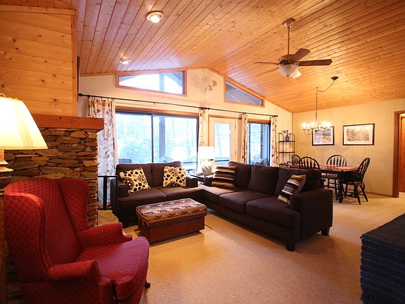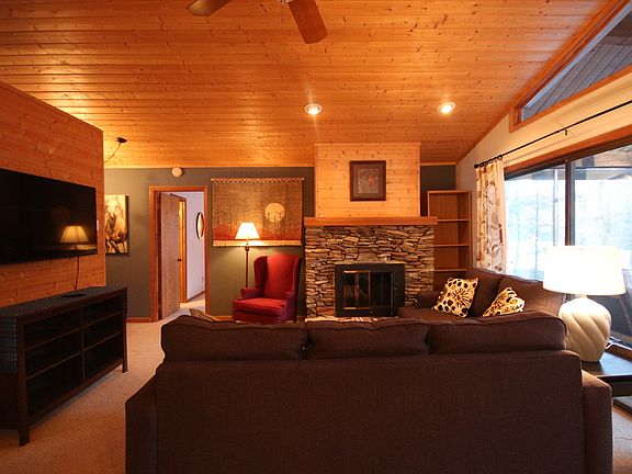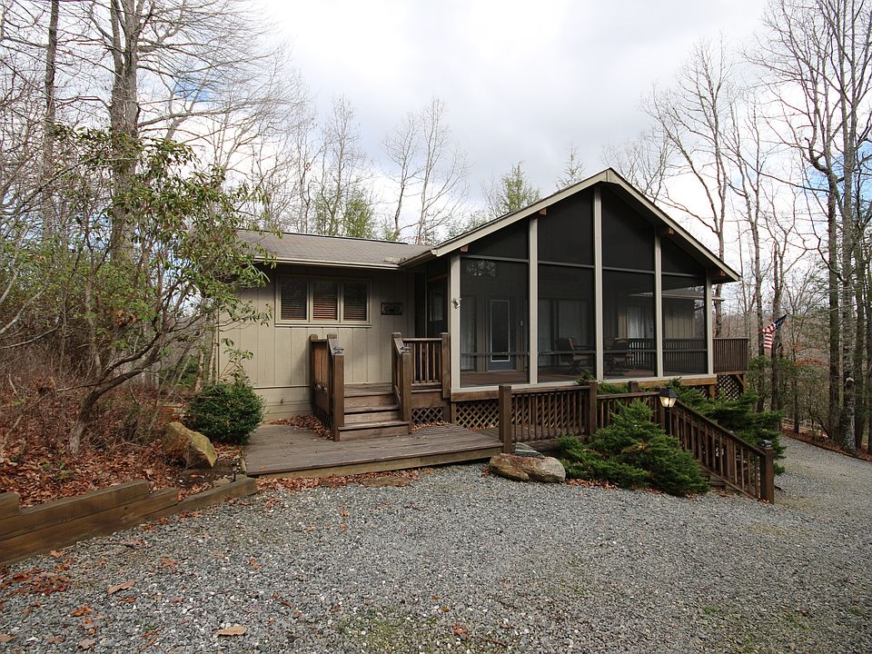 Lovely A-Frame mountain home with large screened in front porch. Master bedroom and second bedroom are separated by the living area. Third bedroom has a futon. Blacktop expansive circular driveway with extra circle closer to the house. Carport area will fit one car.