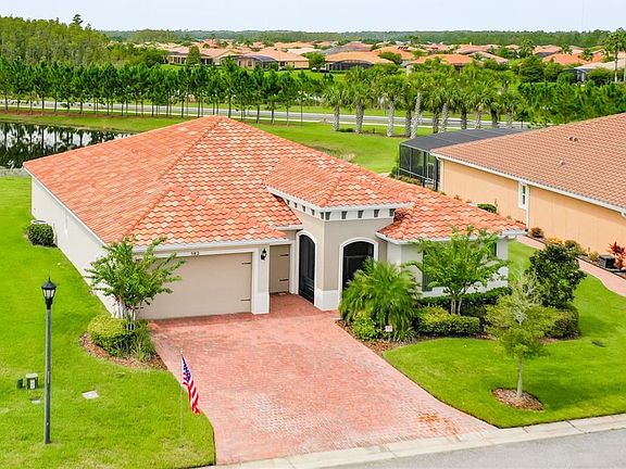 Welcome to this GORGEOUS HOME IN SOLIVITA'S PORTOFINO ESTATES. Built in 2017, this like new AV HOMES SIENA MODEL features a PREMIUM OVERSIZED WATER VIEW LOT with 85' OF FRONTAGE. This open GREAT ROOM FLOOR PLAN HOME is an entertainers dream, a large kitchen with GRANITE COUNTERS AND 42 INCH CABINETS, an OVERSIZED CENTER ISLAND, large dining room with upgraded porcelain tile floors, tray ceilings and crown molding. The master suite features upgraded laminate/wood flooring, tray ceilings, crown molding, a large sitting room, private master bath with an oversized walk-in shower and 2 walk-in closets. The second and third bedrooms are oversized and feature spacious walk-in closets. This home features PLANTATION SHUTTERS THROUGH OUT THE HOME. The exterior includes a TILE ROOF AND BRICK PAVER DRIVEWAY, the BRICK PAVER LANAI AND FRONT PORCH is enclosed allowing for fresh air in the spring and fall to flow through the home. SOLIVITA is a 55+AWARD WINNING golf cart friendly community in Central Florida with 14 heated pools, 2 18 Hole championship golf courses, a driving range with practice areas, a downtown area complete with restaurants, entertainment, a lending library, art studio, community garden, dog parks, tennis courts, basketball, bocce ball courts, softball field, pickleball courts, lakes, ponds, woodlands & pristine conservation. Take a language class, learn to quilt, take a cooking class with one of our chefs or just join the in the SOLIVITA LIFESTYLE FOR THE BEST YEARS OF YOUR LIFE