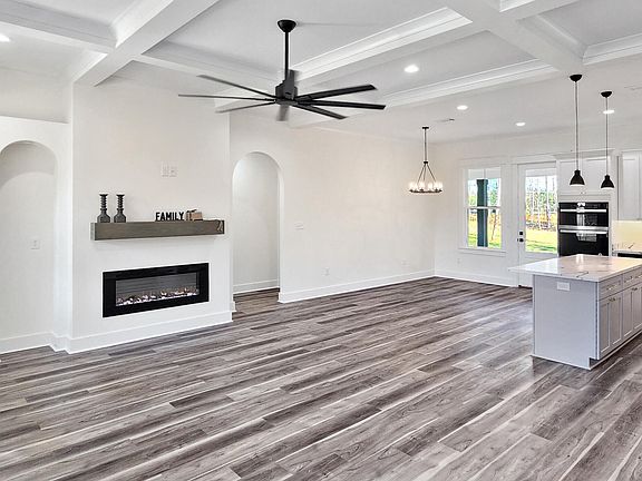 The interior of this home is adorned with GORGEOUSLY CRAFTED coffered ceilings in the living room, 10 ft ceilings in the common areas and 9 ft throughout the remainder of the home, with trey ceilings in the Primary, real wood trim and crown molding throughout, a modern electric fireplace, custom arched doorways and built-ins, durable LVP flooring, and contrasting fixtures and finishes.