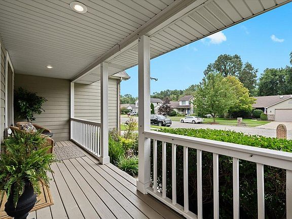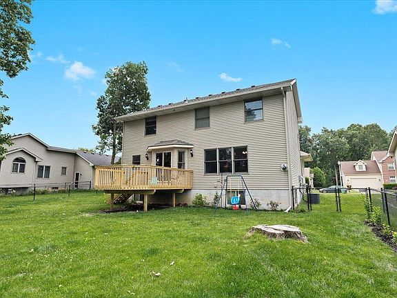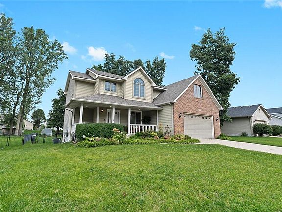 Welcome home to an exquisite colonial with wrap around porch and updates abound! Enter to the two-story foyer that opens to a formal dining room with stately pillars and bamboo engineered hardwood that flows throughout and into the kitchen. The well appointed kitchen boasts quartz countertops, stainless steel appliances, ample cabinetry and a cozy eat-in area. Sliding doors lead you out to the new deck (2024) that overlooks the fenced in backyard. Through the kitchen find the convenient first floor laundry, a half bathroom and oversized two car garage. In the living room you will find a gas fireplace with a beautiful white mantle surround and tile hearth, and an abundance of natural light coming in from the backyard. Upstairs you will pass three spacious bedrooms and a full bathroom as you navigate to an immense primary suite with vaulted ceilings, his and her walk-in closets, three piece bath with jetted tub and an attached finished bonus room! The finished lower level has daylight windows in the living area and craft room, a full bathroom, storage closet under the stairs, and unfinished utility/storage room. New Roof July 2020.