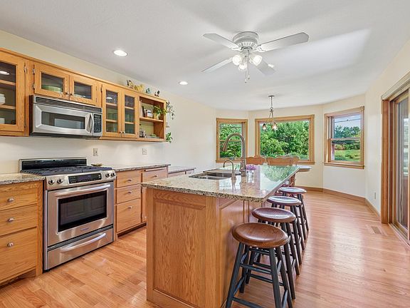 6.19 acre private lot with 2 large out buildings and a small 2 story barn/chicken coop/kennel. Huge outdoor living space with 2 large patios, a wrap around huge deck and large fire pit area. Beautiful gardens and wildlife galore! Stainless energy star appliances, granite countertops, 3 bedrooms on main floor. Main floor laundry/mud room. Lower level walkout has an office/craft room, workshop, plenty of storage and 2 bedrooms with a large family room.