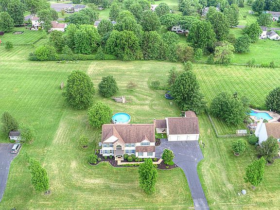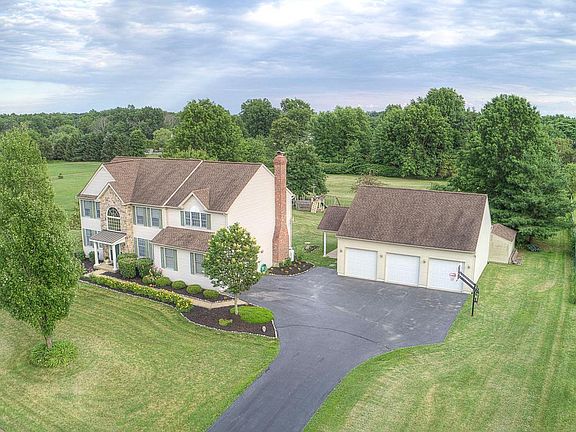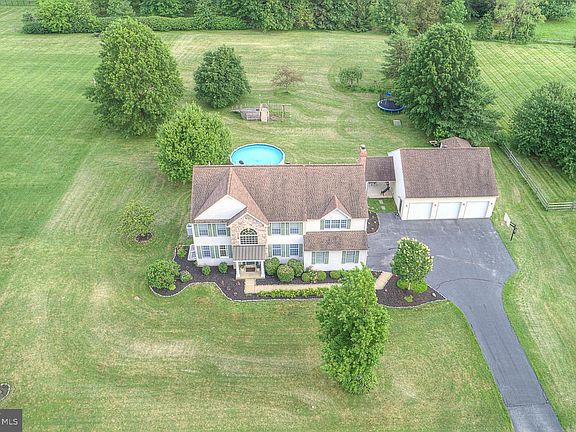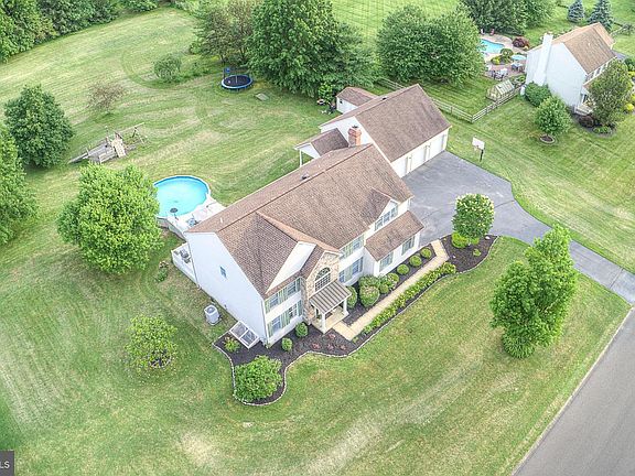 Welcome to this beautiful well maintained 4-bedroom colonial home on 1.5 acres, located in Plumstead Township and award-winning Central Bucks School District. From the moment you enter this home through a covered porch entry, you will notice double story entry. Each room has 9-foot ceilings with attention to detail including updated light fixtures, double crown molding, shadow boxing, and recessed lighting. This open floor plan offers a spacious living room and dining room, large kitchen and family room for all your entertaining. The kitchen has been updated and has stunning cherry cabinets, granite countertops, a tiled back splash, and stainless-steel appliances also includes a center island with family seating. The family room shows off a wall full of windows for bright sunlight, a gas fireplace for cozy winter nights also boasting a distressed wood shiplap accent wall with molding surrounding the fireplace and mantel. Off the family room is a laundry room that leads to an attached 2 car garage. The French doors open to an office that has built-in wall shelving with below cabinet storage. The upper level includes a vaulted master suite, with a large bathroom including a soaking tub that overlooks the backyard. This suite also includes two large walk-in closets and a spacious sitting room. There are three additional spacious bedrooms and a hall bathroom. The finished basement offers additional living space including a separate workout room or playroom, recessed lighting and ample closed off storage. As you move outside, you will notice a sprawling composite deck leading to the pool. The private back yard is large and provides plenty of usable outdoor space to enjoy. This property includes an additional oversized detached 3-bay garage with a full staircase leading to a floored upper level with endless possibilities such as an office, game room or craft room. In addition, this garage has a side patio with a full shingled roof overhang for additional entertaining. This home includes a newer roof, newer HVAC unit, propane fireplace and underground pet fencing.