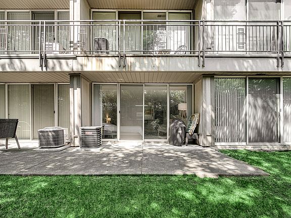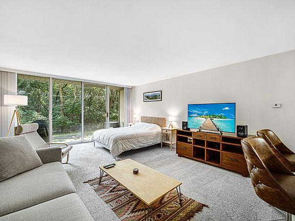 Charming studio unit with recent upgrades throughout. Including HVAC system, plank flooring, and updated kitchen features such as new countertops, stainless steel sink, and garbage disposal, as well as a new stove, dishwasher, microwave, and custom blinds. Enjoy ample natural light and serene views of the woods from the floor-to-ceiling glass doors and oversized concrete patio. This first-floor unit offers a versatile layout for combined living, dining, and sleeping areas, complemented by a breakfast bar for casual dining. Additional highlights include an extra-large laundry room with a stackable washer/dryer, closet storage, one assigned parking space, and access to Four Lakes amenities including pools, tennis courts, and others.
