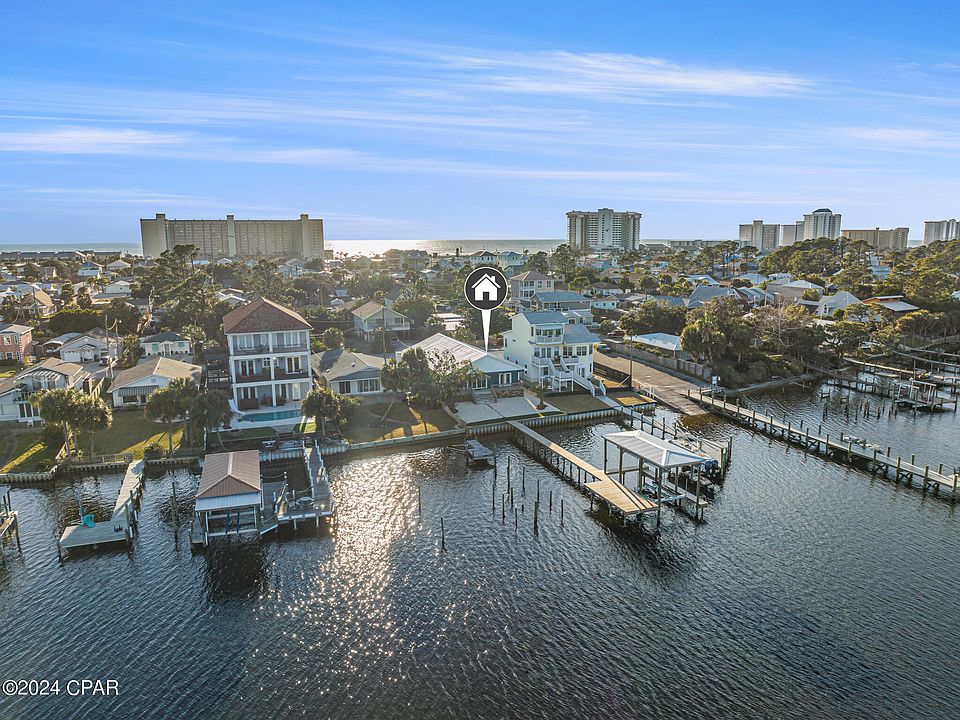 WOW! Rare opportunity to own a luxurious, brand new waterfront home with a new 100' deep-water boat dock and lift. Nestled along the pristine shores of Panama City Beach, this brand new waterfront residence is a coastal dream come true! Offering the epitome of luxury coastal living, this home is a haven for those who crave stunning views, High End craftsmanship and the allure of waterfront living. Walking distance or a short golf cart ride to the Gulf of Mexico. STR allowed with amazing projected ROI. Step into a world of contemporary elegance with an open-concept design that seamlessly blends sophistication and comfort. The interiors are bathed in natural light, creating a warm and inviting atmosphere with stunning water views. Enjoy the luxury of having your private new (7'-9')deep water 100 foot boat dock with 14,000 lb lift for a 32' boat, a new seawall ensuring effortless access to the Gulf's azure waters. Whether it's a sunrise cruise or a fishing trip, the possibilities are endless. Wake up to panoramic views of the Lagoon waters. The expansive windows frame the picturesque scenes, creating a daily spectacle of natural beauty. Culinary enthusiasts will delight in the state-of-the-art kitchen featuring top-of-the-line SS appliances, sleek quartz countertops, custom maple kitchen cabinets, accent European style backsplash and shiplap overlooking the amazing views of the water. Unwind in the lavish master suite with custom pine ceiling beams, walk-in closet and a private access to the back deck overlooking the lagoon. The en-suite bathroom is a spa-like oasis, offering a walk-in shower, walk-in closet and a double vanity. Additional highlights include: Metal Roof, Spray Foam attic & exterior walls, 8 Foot Interior & Exterior Doors, Luxury Vinyl Plank Flooring throughout, New seawall, Garage plumbed for ice maker hookup, Gutters are attached to underground drain, Hardscape landscaping for little maintenance, Wired & plumbed to exterior walls for future outdoor kitchen, 500 gallon septic tank with drip irrigation system, 3 Ton HVAC unit with heat pump, Custom black out shades for living room and more.