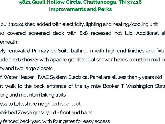 Welcome to 5821 Quail Hollow Circle — a mid-century gem tucked away in the quiet Lakeshore Heights neighborhood near Chickamauga Lake! Nestled on a peaceful cul-de-sac with friendly neighbors and minimal traffic, this 3-bedroom, 3-bathroom single-level home blends timeless design with modern comfort. Located in Hamilton County (with no city taxes or sewer fees), this property offers both privacy and convenience—just minutes from Hixson, Hamilton Place, and downtown Chattanooga. Enjoy seasonal lake views and easy access to outdoor adventure! You're only a short walk from the back entrance of Booker T. Washington State Park, featuring 15 miles of scenic walking and mountain biking trails that lead straight to the water. Homeowners here can also join the Lakeshore Pool for even more recreation close to home. Inside, you'll find hardwood floors throughout, a gas log fireplace, and a newly renovated primary en suite bathroom with high-end finishes—including a 6x6 dual-head shower, custom mid-century vanity, and dual closets. The home's thoughtful updates extend beyond the aesthetics: the roof, HVAC, water heater, electrical panel, and shed are all less than five years old, ensuring peace of mind for years to come. Step outside and unwind on the spacious 16x20 covered and screened deck featuring a recessed 8x8 hot tub with storage underneath, or relax on the multi-level back deck overlooking the fenced backyard. The established Zoysia lawn, rock-bordered garden area, and fire pit (firewood included!) make outdoor living effortless. Additional highlights include a 12x24 site-built shed with electricity, lighting, and heating/cooling, attic storage above the garage, and four gated entries around the backyard for easy access. The stainless steel appliances and Samsung front load washer and dryer all remain with the home. This is more than a home—it's a lifestyle, offering tranquility, community, and outdoor living all in one.