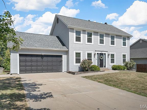 Welcome to 5821 Saddlebrook Drive—a charming & spacious home nestled in an ideal & convenient area near O'Fallon & Cottleville! Built in 1987 & offering nearly 2,000 sq ft of living space, this thoughtfully designed home features 4 bedrooms, 3 bathrooms & has been nicely updated by the owners over the past 11 years. The main floor boasts beautiful engineered hardwood flooring & features a separate dining room, a bonus room that could be used as an office or living room, then a cozy family room adjacent to the kitchen w/plenty of natural light, a wood-burning fireplace framed by custom built-ins, & a beautiful kitchen w/white cabinets, granite counters, newer stainless steel appliances, & plenty of storage space. Off the kitchen, step outside to a brand-new concrete patio surrounded by newly planted arborvitaes & built-in fire pit; creating the perfect setting for backyard fun & relaxation. The newer, attractive wood staircase inside leads you to the 2nd floor w/newer carpet throughout, a spacious primary suite w/walk-in closet, double sink/vanities, & separate tub & shower. An updated 2nd full bathroom & 3 addt'l bedrooms provide room for all family members and/or an additional office/guest room. The walk-out basement offers more storage space & is waiting for your finishing touches! With newer windows throughout, a finished 2 car garage,& a prime location near Hwys 94/K/40/364/70, top rated schools, shopping, & dining; this move-in ready home is ready for its next homeowner!