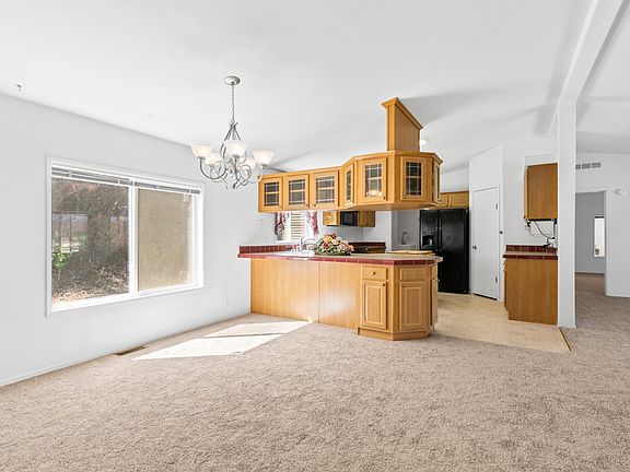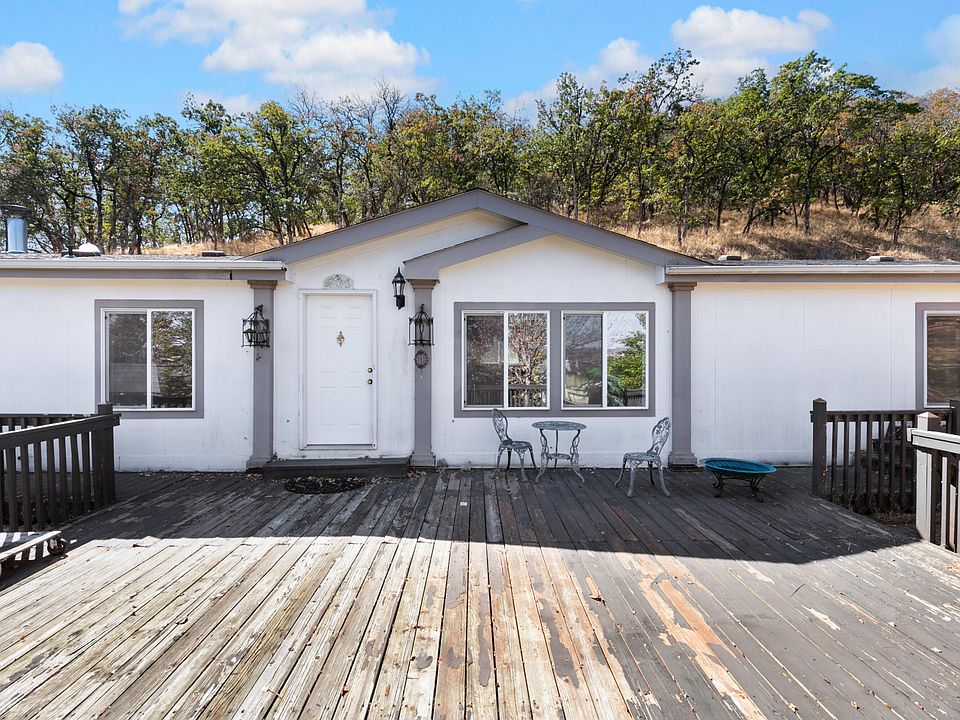Extremely Close to Town Country Property with 5 Beautiful Acres*Single Level Double-Wide (One Owner) Home* 3-bedrooms 2-bathrooms located on top of a private, quiet hill w/incredible views & lots of wildlife. Huge front deck, excellent garden area, lots of trees, & lots of privacy. This lovely home has a spacious open floor plan with brand new carpet. Vaulted ceilings, separate living room and family room, and the living room offers a wood-burning fireplace. Forced heat & air with all new ducting. Kitchen boasts tons of cabinets, mobile island with drop-leaf cutting board surface, new stainless-steel dishwasher, large pantry and eat at breakfast nook. Laundry room includes washer & dryer and is spacious with additional cabinets and newer utility sink. Primary suite includes double vanity, oversized garden tub and ceiling fan. Huge detached 2-car garage plus 2-car carport, small shed for storage, and tons of room to roam. This is a must tour.