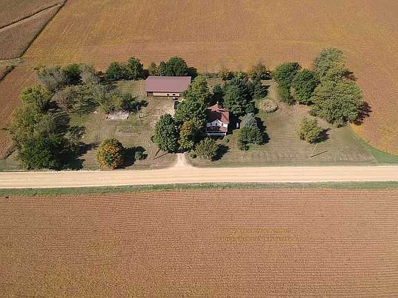 Farmhouse on 2.5 acres. Surrounded by farm fields, this home is located 3 miles from town on a well maintained country road. Plenty of room for animal and gardening hobbies. Large gravel parking area. 42x72 steel pole building with 200amp service, 2 overhead and 2 service doors, 12 foot walls. Blank canvas with great possibilities. This two story home features a full front and small side porch. Bright kitchen has all new appliances. Dining room off kitchen with small loft above. Butlers pantry has ample storage. Nice size parlor and living room. Large full bathroom on first floor includes new front loads in laundry closet. 2nd floor has four bedrooms, each with a walk in closet. Small half bath and new windows on 2nd floor as well. Walk up attic has plenty of room for storage. Fresh paint and new flooring throughout the whole house, together with all original woodwork. Full basement, plus new 96% efficient LP furnace. Central air. Mature trees shade home from summer heat.