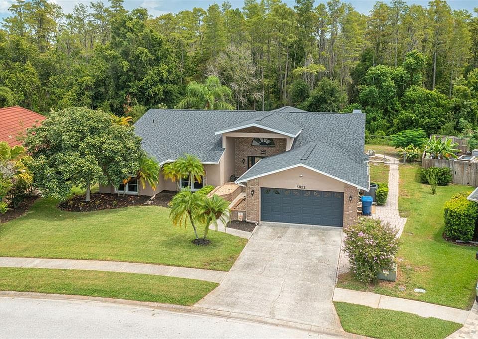 WELCOME to River Crossing. This beautiful 3 bed, 2 1/2 bath, 2 car garage pool home has a beautiful open floor plan. This home sits on an oversized .27 acre lot and backs up to lovely conservation (so no rear neighbors). 5822 Redhawk has an impressive 2662 sq.ft.under roof and has a formal living room, family room, and dining room with a beautiful bay window seat. Even though the spaces are designated it's a lovely open floor plan with stunning vaulted ceilings. The kitchen is massive with lots of cabinet space, cambria quartz counter tops and a complete LG appliance package (smart slide-in Electric true convection range with EasyClean, Air Fry, and Instaview and a 4-door French door Refrigerator with Dual ice maker).Just off of the kitchen is a keeping/family room complete with French doors to the lanai and a lovely wood burning fireplace. The grand primary suite 21x16 has double french doors leading to the pool area. Double interior doors lead to the oversized ensuite master bath with a large walk-in closet and jetted spa tub. This property is fully fenced with a backyard oasis overlooking the wooded conservation area and a large open brick pavered patio with an additional screened lanai. NEW dimensional shingle roof installed in 2020, New hurricane impact windows were installed in 2022. New Luxury Vinyl flooring installed in all the bedrooms (2022)The pool pump was replaced in 2022 and a salt water conversion added. Short drive to the Gulf of Mexico, minutes to the Suncoast Parkway and wonderful restaurant and shopping options in Trinity just a short drive away. ***Settlement stabilization was completed in 2014 (fully insurable and documents on file).***