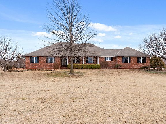 You will be living the dream with acreage near the city in this beautifully designed sprawling brick ranch located on 5 acres in Derby near McConnell Air Force Base. Enjoy an expansive open floor for easy entertaining with brand new carpeting throughout, newly renovated guest bathroom, a lovely living room with two-way fireplace, crown molding, and large windows! This area opens to the formal dining room with crown molding, informal dining area with large windows, and a chef's dream granite kitchen with hardwood flooring and an incredible island with extra storage space. The convenient laundry room is located right off the kitchen! Spend peaceful nights in this spacious main floor master suite looking out the windows to the private backyard! It includes a walk-in closet, newly renovated bathroom with heated tile flooring, soaker tub, tile shower, and onyx vanity with double sinks. Enjoy hanging out in this fabulous finished basement complete with rec room with sliding glass door to the patio and viewout window, built-in bookcases, and enough space for your favorite game table. This lower level also features an additional bedroom, full bathroom, potential of a finished bonus room (the pool table stays with the house), storm room, radon mitigation system, and ample storage space! Check out the many fruit trees in the backyard from the covered deck. Do you work on cars, have big toys to store or love to tinker with carpentry? You will love the massive 60 x 40 shop complete with plumbing for an air compressor, 100 amp service, heated 80K BTU Big Maxx furnace, finished and unfinished area and RV parking. Chicken coop area in back too. Horses allowed! You have to see it to believe it!