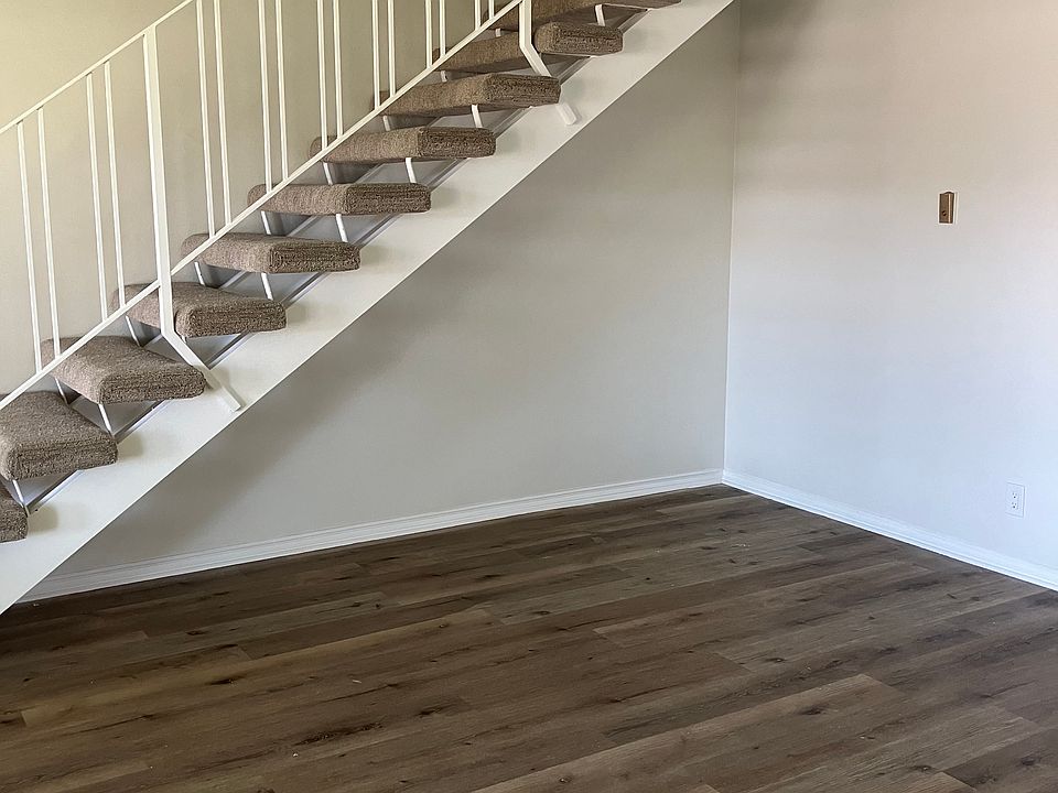 COMING SOON two-story mid century style apartment. Spacious first-floor living room, dining room kitchen with 1.5 bath. Classic floating staircase leads to second-floor bedrooms and full bath. Each bedroom has extra large closet. Master bedroom has its own walk-in closet. Tastefully appointed with new kitchen cabinetry, lighting, appliances, bath cabinetry and fixtures. All new paint and carpet. Includes single car garage with automatic opener. Appliance delivery delayed August 24th or later. Taking applications Owner pays water and trash. Resident pays utility and renters insurance.