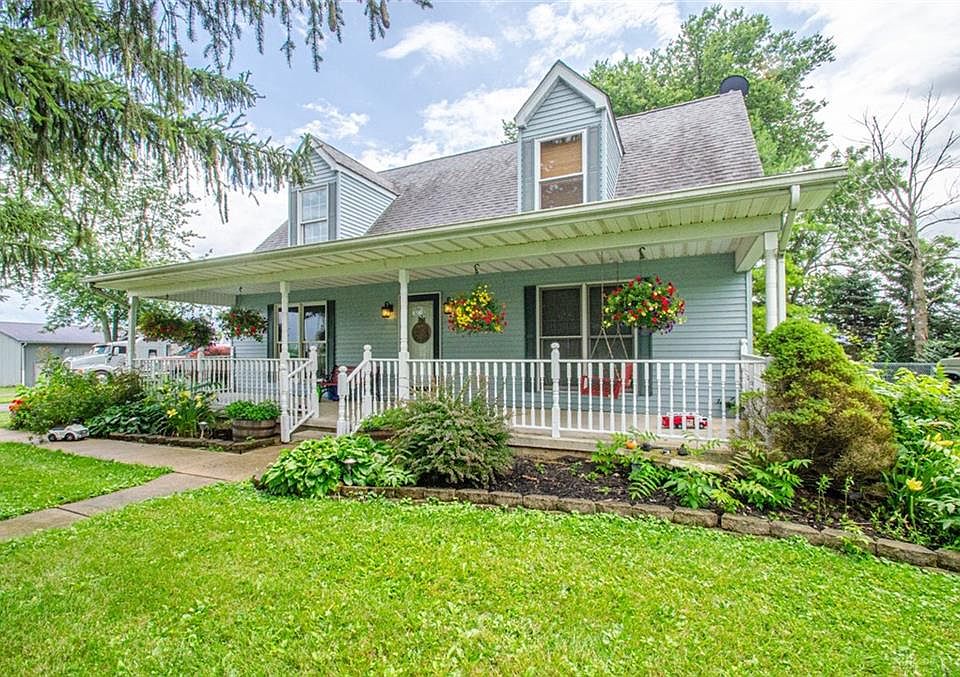 Enjoy Country Living! This charming 3 bedroom 2.5 bath Cape Cod sits on 2 acres between Eaton and Richmond! Relaxing front porch. Nice spacious LR with sight lines to the back deck. Lots of cupboard and counter space in Kitchen. 1st Floor Master with walk in closet and attached bath. 2 bedrooms upstairs which share a full bath. Full unfinished basement. Large garage with walk up attic storage, plus pole barn, part of yard is fenced. Beautiful 360° views.