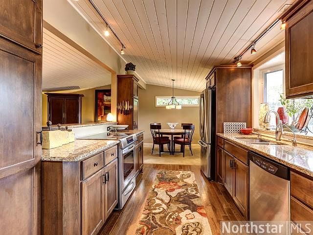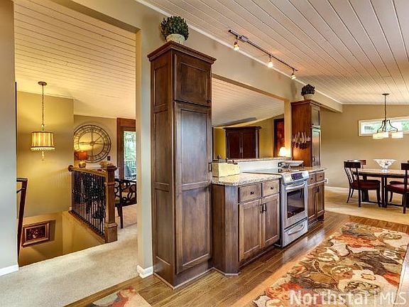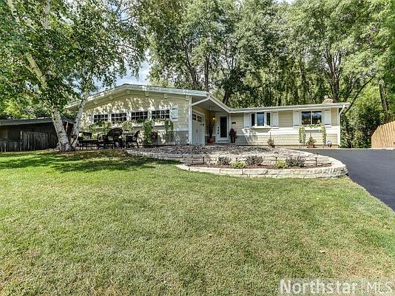 Stunning home overlooking private setting on a pond. New: AC, Roof, Hardi Siding, 2 skylights, garage door, deck. Open floor-plan, granite kitchen, vaulted LR ceiling, finished walkout BSMT, wet bar & much more in this highly sought after Edina area.