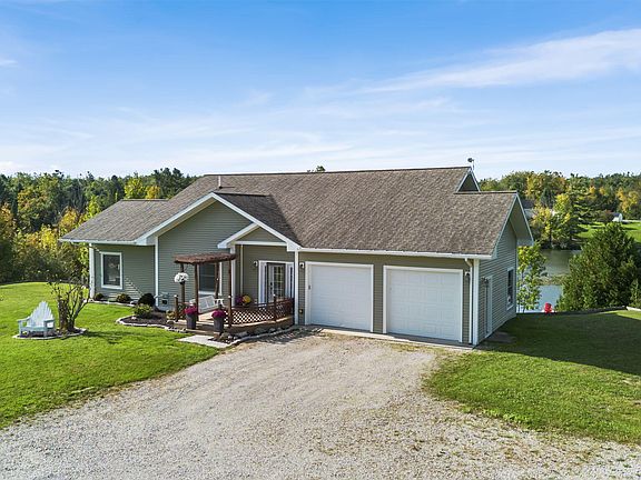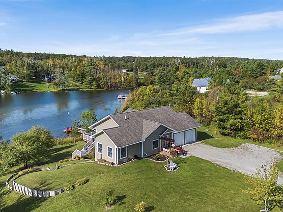 TAKING BACK-UP OFFERS---Savor the stunning Black River frontage from the expansive main level deck or enjoy a leisurely pontoon ride from your private dock to all-sports Black Lake. Upon entering the main level, you will be greeted by an open concept design featuring windows that showcase breathtaking views of the river while allowing an abundance of natural light. This residence features three bedrooms, two and a half bathrooms, an oversized two-car garage, full finished walkout basement allowing easy access to the river, and radiant in-floor heat throughout. Additional amenities include all new LG ThinkQ appliances installed in 2024, wired for a whole house generator, a spacious approximately 2300 sq ft three-plus bay pole barn ideal for storage and hobbies. Situated on nearly two acres of land perfect for gardening, entertaining guests or simply enjoying a quiet night outdoors by the fire.
