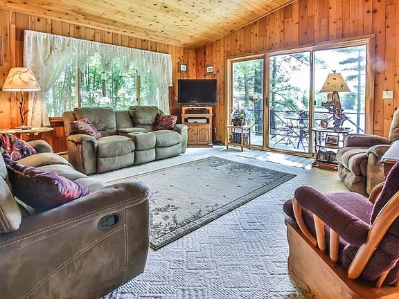 Meticulous Manitowish Waters Chain Property! 3BR, 2BA home on 181' perfect, south facing sand ftg w/1.36 acres! 2,400 sq ft warm & inviting home w/cedar T&G throughout! LR has vaulted ceiling & sliding door to lakeside deck that runs the full length of the house. K has pine cabinets, maple floors & is open to the DR which also has a sliding door to the lakeside deck. Main floor includes MBR, full BA w/dual vanities & laundry/mud room w/access to attached garage. LL has FR w/sliding door to lakeside patio, built in hot-tub, wood burning FP w/insert, 2 BR's, full BA & utility room which also accesses the attached garage. Storage galore w/attached 28X26 heated & insulated garage w/storage above, 26x24 detached garage, garden shed, wood shed & storage shed by the lakefront. Exterior grounds are very well maintained & include a fenced garden area. Plenty of level space at the lakefront to spread out & enjoy the water, permanent dock space offers room to dock several boats! A must see!