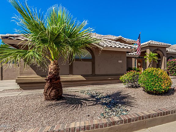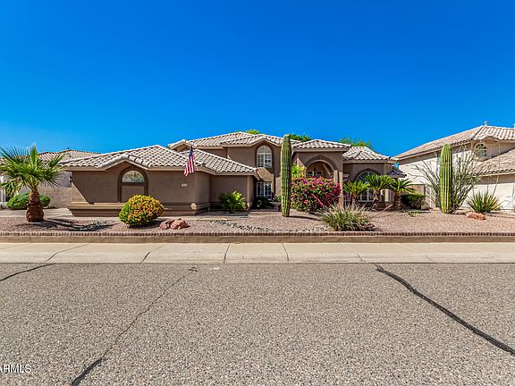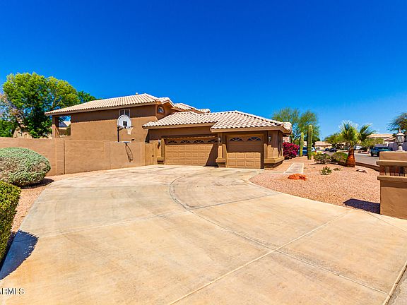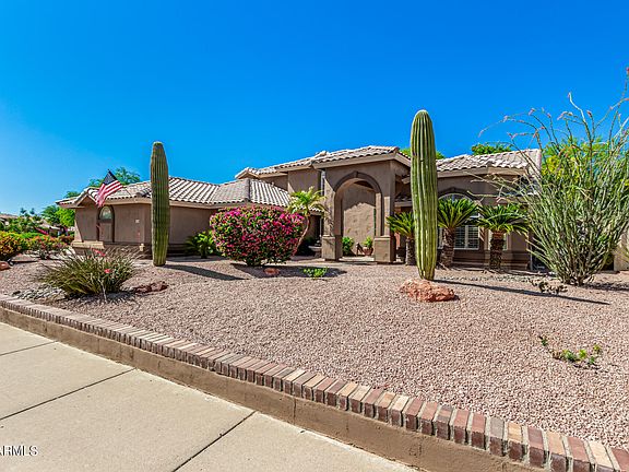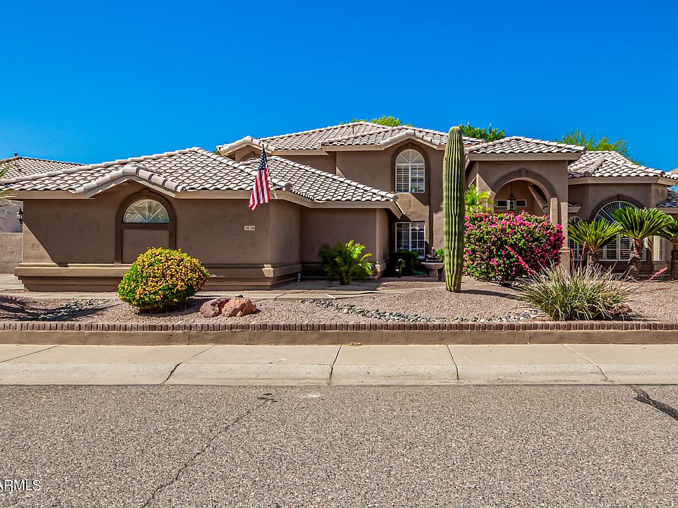 MOUNTAIN VIEWS! Pride of ownership certainly shows in this exquisite gem in Pinnacle Hill. This beautiful home features 3635 sq ft, 4-bedroom, 3 baths with a flex room/den that can be easily converted back into a 5th bedroom. It has a 3-car garage with cabinets, & 6 car curved driveway with basketball hoop for fun family game time. The garage has its own sub panel w/ a 220V outlet for tools and equipment. The bedroom and flex room downstairs feature walk in closets. The downstairs bathroom was remodeled in 2020 w/ stylish ADA grab bars in all directions, multiple shower heads, and a low entry shower w/ built in bench. The downstairs has a spacious living room w/ a fireplace & a bar with cabinets, sink & additional outlets; currently functioning as a secondary mini kitchen. Continued..... The main level has gorgeous mahogany flooring in the kitchen, dining room, and entry way. In the kitchen you'll find granite counter tops, double ovens, an extra-large island, homework station with a large pantry, and butler door into the dining room. The main level also features a second living room with lots of natural light, and new carpet installed in 2024. The upper-level features 3 bedrooms, a shared bathroom, large walk-in linen closet, and the master suite. New carpet in bedrooms and closets in 2024. The shared bathroom was recently remodeled in 2022 with new tub, shower, toilet, and fixtures. The master suite is very spacious with a balcony, large bathroom, 2 walk-in closets and separate toilet room. The bathroom is very roomy and has a larger remodeled shower, new fixtures, relaxing soaking tub, separate vanity spaces, and make-up bench. There is an intercom system throughout the entire house that was upgraded in 2020. It connects to the doorbell and can be used as surround sound for music. The house has central vac on all levels and comes with all attachments. The serene backyard boasts a fully covered long patio with Saltillo tile flooring, outdoor fireplace with built in seating, BBQ, and a shimmering pool with rock waterfall. There is a low maintenance side yard with pet turf and beautiful desert landscaping. This home has been very well maintained, loved, and cared for.
