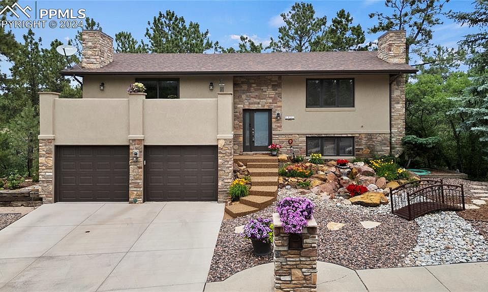 Gorgeous home in the coveted Erindale Heights community! This meticulously maintained 2-bedroom, 2.5-bath residence is packed with features and upgrades. Inside find a stunning main living area adorned with beautiful wood beams, a stone-to-ceiling gas fireplace, oak flooring, and a perfect view of Pikes Peak! The kitchen includes stainless steel appliances, a gas range, and abundant cabinet space. The spacious main-level master bedroom features an ensuite with a large spa shower, a walk-in closet, and the continuation of the oak flooring. The lower level includes smoked hickory flooring, burnt and made by hand by the Amish, a large family room, another bedroom connected by a Jack and Jill bathroom, and the laundry room. This home is a perfect starter home for a young couple or for an empty nester couple who is downsizing. The thoughtful design and efficient use of space cater to both lifestyles, offering comfort, convenience, and a touch of luxury in a peaceful, well-established neighborhood. The amazing outdoor oasis is complete with a year-round pondless waterfall, multi-level Trex decking, a hot tub, and professional landscaping, creating a tranquil environment for relaxation and entertainment. Situated on a quarter-acre lot, this home is surrounded by ponderosa pines and vibrant flowers. The exterior has been newly painted, along with elastomeric stucco on the front and sides. The addition of the new driveway, epoxy stairs and a matching stone mailbox, beautifully enhances the home's curb appeal. Finally, the oversized 2-car garage offers abundant space for vehicles and storage. The owner elected to have their own, thorough inspection, ensuring that every detail has been carefully scrutinized. From the smallest touch to the largest feature, everything has been meticulously addressed to guarantee it is in pristine, move-in ready condition!