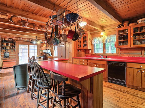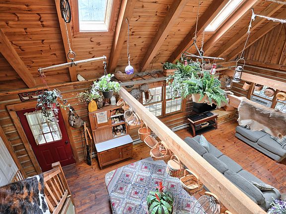 Country chic. Handsome custom-crafted log home. All-natural wood interior. Wide plank floors. Wood ceilings. Peaceful wooded setting. Enjoy nature. Open floor plan w exposed beams. Perfect for entertaining & comfortable living. Magnificent. Great room. Spacious dining. Skylights. Main level bedroom. Loft. Recent 30x40 3 car garage plus barn. Wonderful year round home or perfect country getaway.