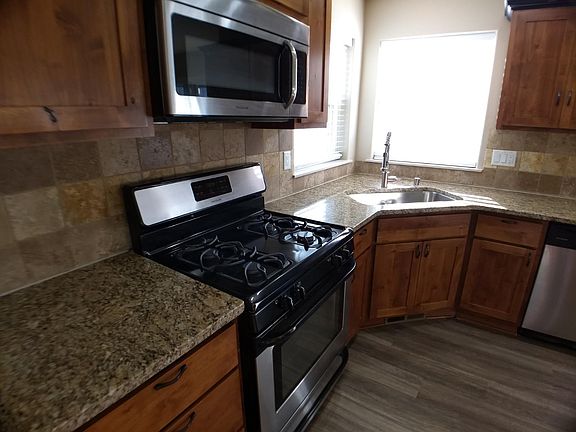 Spacious great room with tile surround fireplace, dining w/ bay window & covered patio access. Lg kitchen w/ granite counters, tile backsplash, stainless appliances, walk-in pantry & center island w/ breakfast bar. Plank flooring throughout downstairs. Upstairs, 4 spacious bedrooms including master w/ private bath, infrared heat & walk-in closet + huge bonus room w/ dual closets- could also be large 4th bedroom. Situated on a cul-de-sac lot, this home backs a greenbelt for extra privacy. City views from upstairs. Tenant responsible for all utilities and HOA.