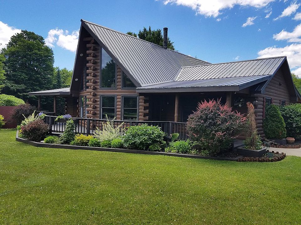 This property is sure to please any buyer. This 2 Bedroom/2 Bath Log Home located on +/- 11 acres of land is a complete paradise. Modern luxury meets rustic wildlife. The loft area of the home is the perfect place to work from home or enjoy some quiet time. The center piece of the home is the stone fireplace. Updated kitchen includes new refrigerator, flooring, counter tops, sink and cabinet hardware. Newly remodeled bathroom. New flooring in spacious laundry room. New Roof in 2017. Spacious primary bedroom with walk-in closet and primary full bath. Property includes the ultimate 4+ car garage, which includes oversized workshop in the back of the garage which has a half bath, entertaining area and an automotive lift. The garage includes a spacious second floor deck which leads to a room above the garage, which can be used for guests or for additional storage. The front area of the garage includes large bays, storage and a wood shop. Gorgeous courtyard with Adirondack style gazebos and inviting deck (new in 2018) which lead to the above ground pool (new Fall 2021). Garage is heated with a pellet stove and wood stove. You will never lack storage with the addition of two pole barns. House is equipped with high-speed internet perfect for working from home or streaming your favorite programing. Cable became recently available but would need to be run to the home. The property has a 16' x 16' garden bed perfect for growing your own veggies. Next to the greenhouse you will find a well-maintained Concord Grape arbor. Perfect for making your own jelly, syrup and juice. Seller was previously a licensed real estate salesperson. This sale is not brokered through any agency. Real Estate agents are welcome to show home. Seller willing to negotiate a reasonable commission to any agent that brings a sale.