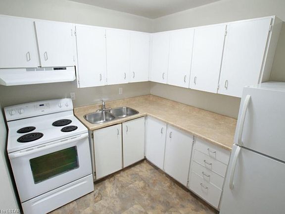 Top floor! Vacant. 1 bedroom + den at "Sunrise Condos" with big balcony (gas BBQ's allowed). Great views. Hard surface flooring throughout. Family friendly neighborhood, surrounded by mature trees, walking distance to all the great shopping at the corner of Oxford and Highbury. Bus stop at your front door. Massive renovations underway in this complex; new windows, patio doors and balcony railings already installed. New hallway flooring, lighting, painting, entryway, lobbies and laundry rooms are in the process of being completed in 573 & 583. See building 563 for the finished look! Property tax is $1125/yr. ALL-INCLUSIVE Condo fee is $313/mth includes heat, hydro, water and one assigned parking space (C-61).