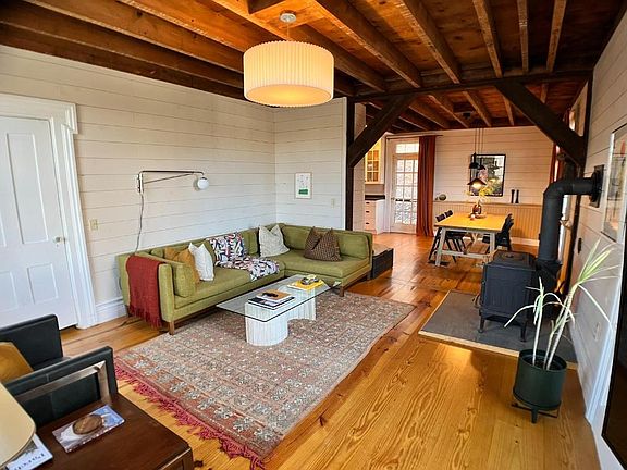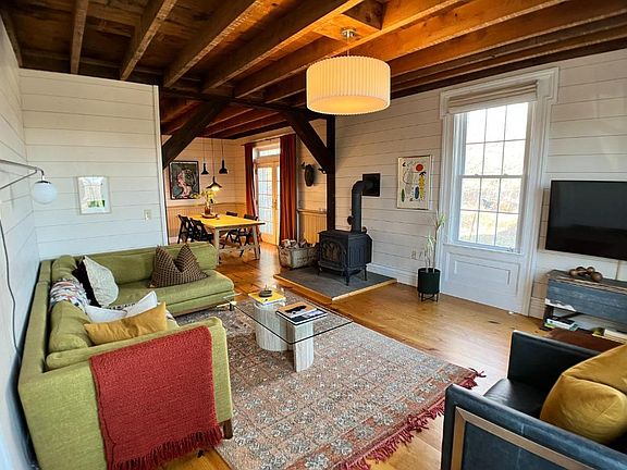This historic Greek Revival home sits on just over 4 acres between the quaint villages of Stamford and Jefferson. This 3 bedroom, 2 full bath home has been completely renovated within the past 6 years and showcases impressive upgrades while keeping with many of the original details. Upgrades include a new furnace, electric, insulation, plumbing, windows, drainage, and an annex of the house has been transformed into a gorgeous en-suite master bedroom with new foundation. Random width wood flooring and original moldings throughout the house will surely impress. The light filled living room has oversized windows, 10 foot ceilings, shiplap walls, a cozy woodstove, and exposed beams that frame the entryway into the dining area. The living room flows seamlessly into the dining area with french doors leading to the side deck. The open concept of the kitchen/dining areas lends for easy entertaining. The charming kitchen features an island with storage space, glass front cabinets, farmhouse sink, retro style refrigerator, wood countertops, and a glass paneled door leading to the back of the house.Completing the first level of the house is a breathtaking master bedroom with en-suite bathroom