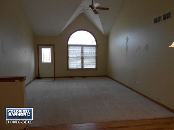 Quality-built, semi-custom villa (duplex) home in Deerpath Creek subdivision. Brick front, 9' & vaulted ceilings, hardwood floors, large LR & Kitchen with light cherry cabinets & Corian countertops, center island, covered deck looking out on prairie of wildflowers in summer and fall. First floor laundry with built-in cabinets. Huge basement w/roughed-in plumbing. Neutral decor. Taxes do not have exemptions
